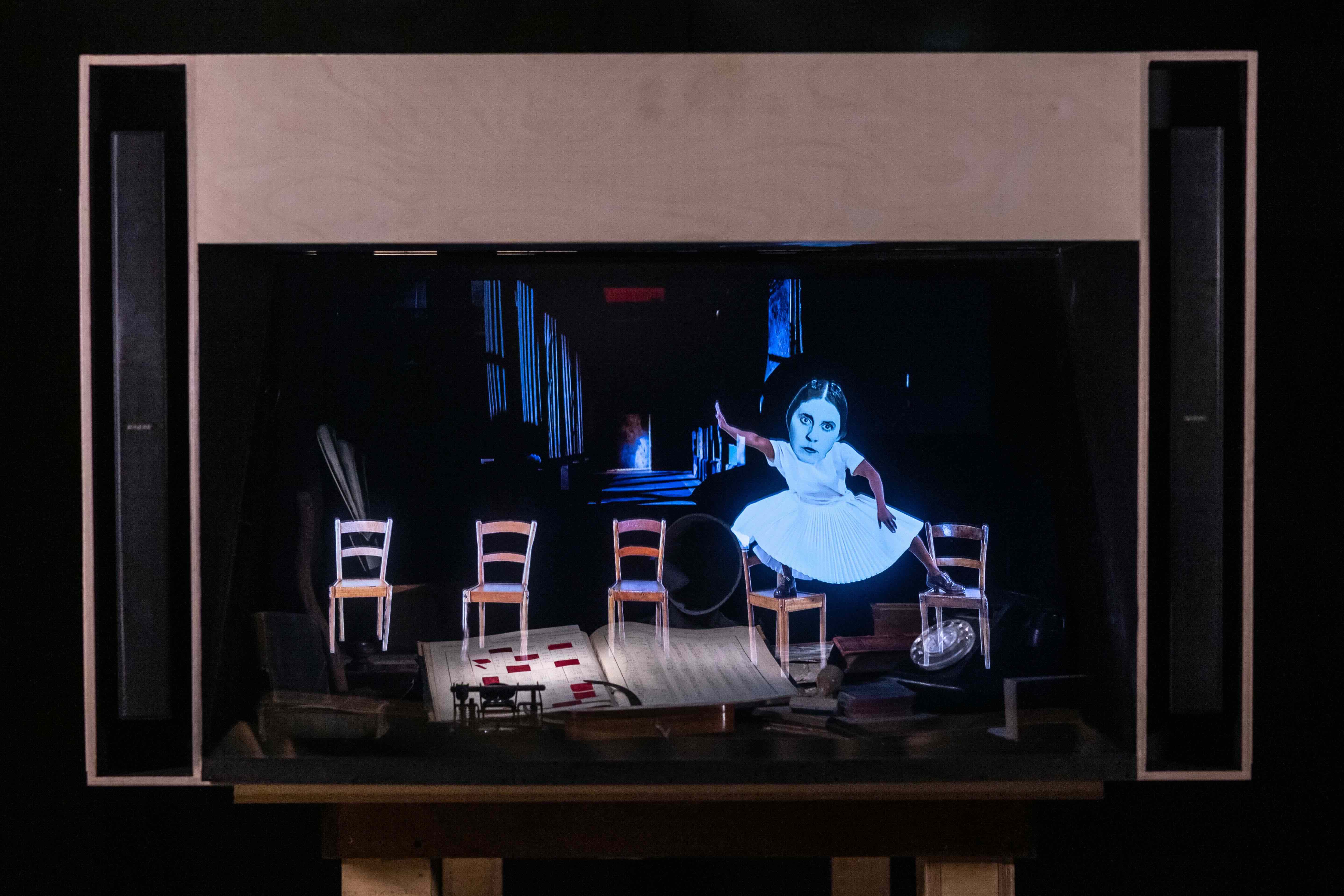 Set designer e collaboratrice di lunga data di Kentridge, Sabine Theunissen crea un'opera completamente nuova, mescolando il suo tipico stile scenografico con la proiezione di vignette create con pupazzi, il suo approccio al Pepper’s Ghost dà vita a un'installazione immersiva e performativa in miniatura.