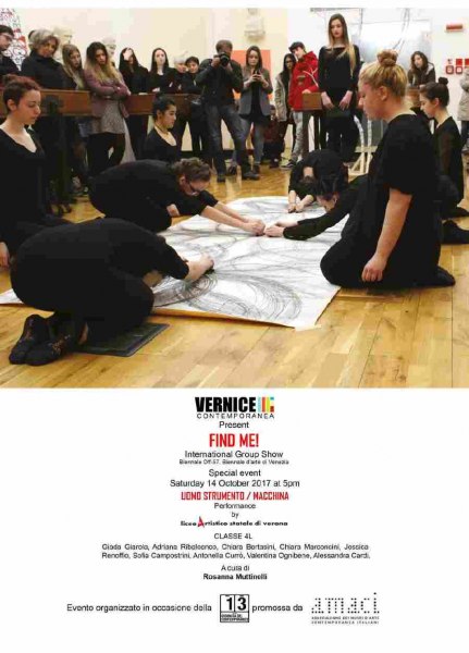 Vernice Contemporanea presenta Sabato 14 Ottobre alle ore 17.00, all’interno della mostra FIND ME! International Group Show-Circuito Off / 57. Biennale d’Arte di Venezia inaugurata lo scorso 30 Settembre presso l’ex spazio KANZ di Venezia-Santa Croce 1592 UOMO STRUMENTO/MACCHINA. Performance della classe 4L del Liceo Artistico di Verona. La performance oltre ad essere inserita nel circuito esterno della Biennale d’arte è stata patrocinata da AMACI (Associazione Musei Arte Contemporanea Italiani) in occasione della tredicesima giornata del Contemporaneo.