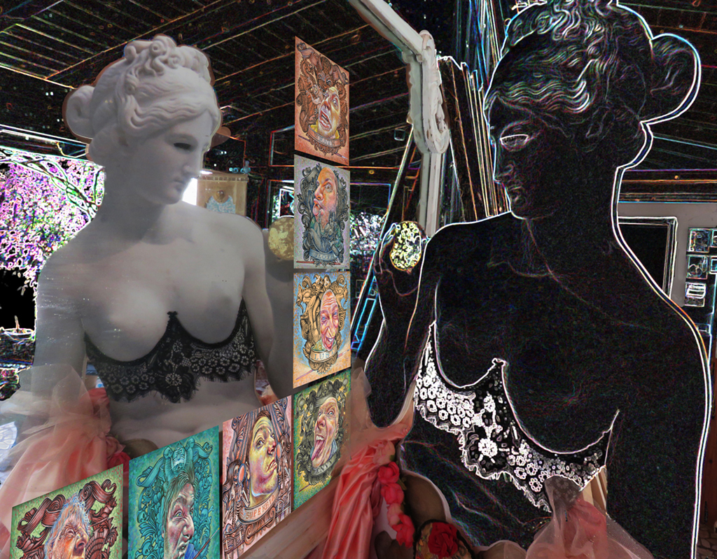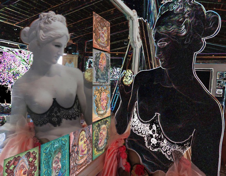 < Ad oltre cinquant’anni di distanza dal capolavoro di Pistoletto, nella Venere dei guardoni di Momò Calascibetta la statua di Thorvaldsen ha voltato le spalle agli stracci, in cui non rovista più come un barbone, e non nasconde le sue grazie, anzi le mette in vetrina: come nella Maja vestida di Goya, gli abiti à la page che la ricoprono sono, più che un freno, un incentivo alla lussuria, al consumo sfrenato.Del resto la Venere “vestita” non rappresenta mai l’amore sacro, cui ben si addiceva la nudità di Pistoletto, ma il suo doppio profano. Anche i materiali hanno un peso differente; figlia di un’epoca “leggera”, in cui l’essere è apparire, non importa che il suo corpo sia di cemento, di gesso o di marmo pregiato: una sagoma basta a impersonarla.Non a caso i veli che la cingono, come certi risicatissimi abiti neopunk, mostrano fuori quanto forse dovrebbe restare celato: le ossa di un cadavere, un teschio all’altezza del pube.Se dunque, riassumendo, Pistoletto si interrogava sul linguaggio dell’arte nell’epoca della sua riproducibilità, il focus di Calascibetta non è tanto sull’espressione artistica, articolata in modi naturali come il cucito o la pittura, quanto sui guardoni: i destinatari finali, o meglio le vittime, di un’arte corrotta dagli abusi del mercato e dalla pubblicità.Li ritroviamo ora, come nella Venere che esce dal bagno di Giambologna presso la grotta del Buontalenti, raccolti tutti intorno a Venere e vogliosi di guardare.Essi però, come è sempre più frequente in tempi di trionfo del virtuale, non sono presenti in forma fisica. I loro volti “viziosi” si riflettono, come in Velázquez, o in tanti altri lavori di Pistoletto, su uno specchio collocato alle spalle della sagoma.Chi, traversando Corso Vittorio, ritrovi per un attimo il suo volto in compagnia dei loro, non si preoccupi troppo. Venere non cambia, è sempre uguale. Il suo unico scopo, come è solito ripetere un amico banditore, è “diffondere amore”>.
