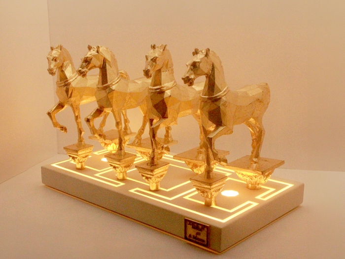Le opere di Michele Dal Bon sono reinterpretazioni in chiave cubista di capolavori assoluti della scultura antica e moderna, arricchite con la foglia d’oro 24 carati. Questo prezioso materiale non è solo decorativo, ma rappresenta un elemento simbolico, un ponte tra il divino e l’umano, capace di trasmettere un senso di sacralità e di creare un’esperienza visiva unica. Le sculture, infatti, sono illuminate internamente da luci LED, che permettono alla luce di filtrare attraverso il craquelé dell’oro, generando un’esplosione luminosa che esalta i dettagli delle forme e avvolge lo spettatore in un’atmosfera di intensa spiritualità.