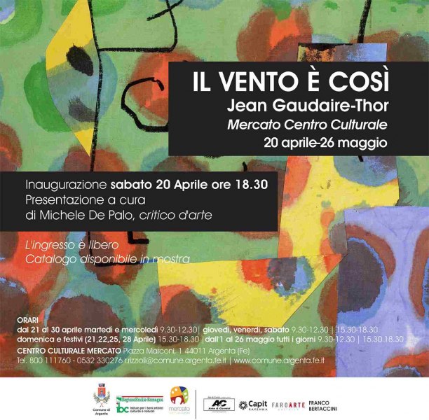 Sabato 20 aprile alle ore 18.30 al centro culturale Mercato di Argenta inaugura la mostra "Il vento è così", promossa in collaborazione con Arte e Cornici di Argenta, l'Associazione Capit di Ravenna, la Galleria Faro Arte di Marina di Ravenna. L'iniziativa espositiva è a cura di Franco Bertaccini.