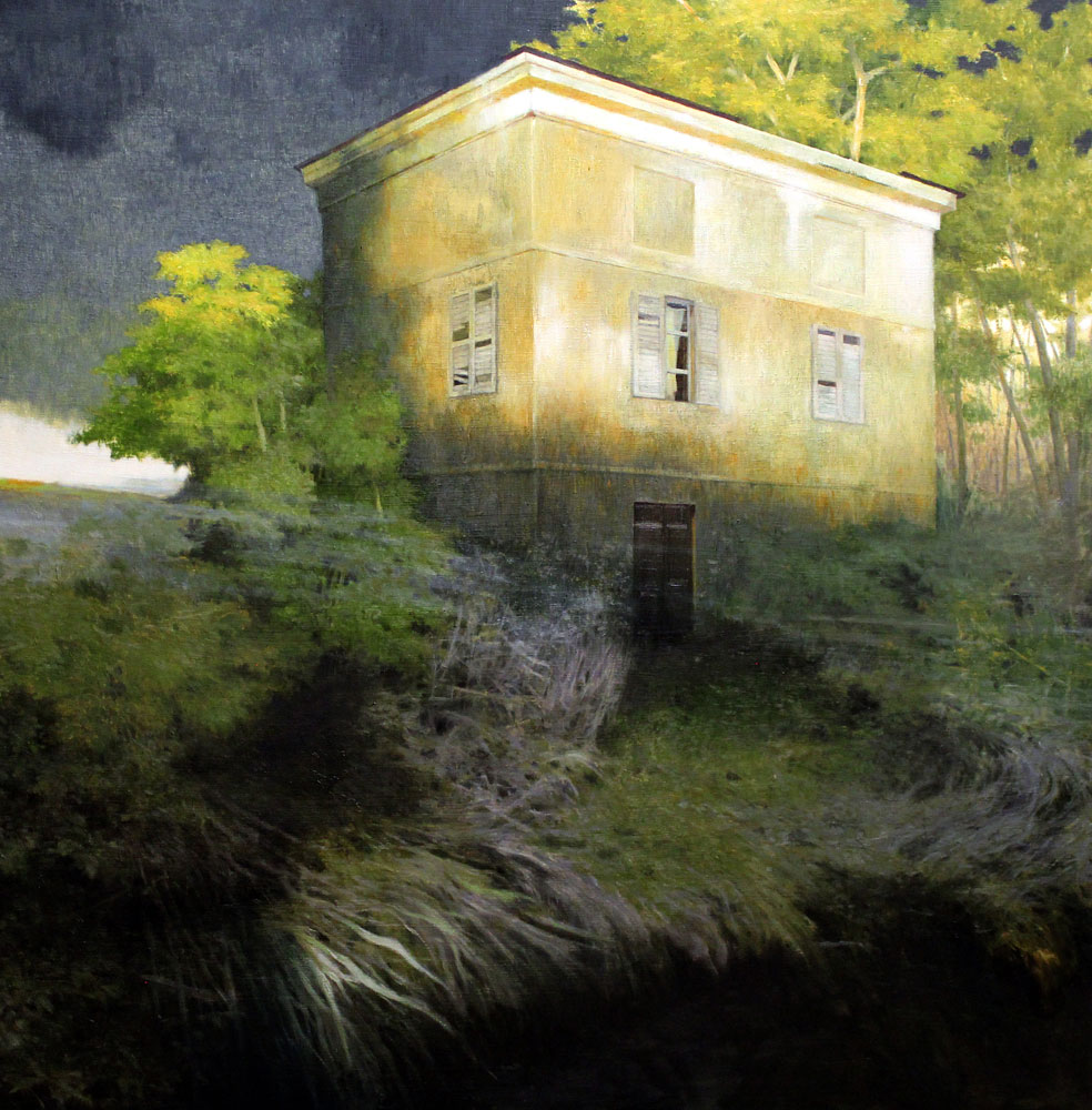 Carlo Cane è sempre stato affascinato dalle architetture. All’inizio erano i grattacieli. Volumetrie immense con finestre tutte uguali erette all’infinito contro il cielo. Un presente storico che ragionava sull’alienazione e la solitudine, quella dura e sedimentata nella vita cinetica di una metropoli. Quindi l’artista di Alessandria si è lasciato convincere dalla malinconia entrando nella dimensione del tempo già passato. Sono nate così le abitazioni familiari, le baite, le ville di campagna abbandonate e silenziose, situate in una dimensione surreale. Veleggiano in una quinta stagione dove se c’è la neve a coprire alberi nudi dei dintorni non si sente freddo, se la primavera ha riempito di gemme le piante del giardino non ne percepisci l’odore, se il sole estivo ha fatto rinverdire la campagna, quel sole non scalda. Sospese con tutte le fondamenta in uno spazio reinventato, custodiscono per sempre tutto ciò che hanno visto passare. Sono l’album dei ricordi di intere generazioni e si sfaldano piano piano un giorno alla volta, fino a essere sul punto di scomparire. Cane con questa ricerca sfiora il nichilismo romantico assegnando alle case il compito della conservazione. Ferme per non perdere una sola traccia, restano impavide controvento. Poi, assorbite nella Natura che le circonda saranno altrove, diventando immortali.
