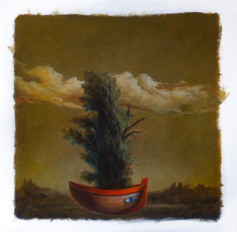 Ciro Palumbo sposa la maniera di De Chirico nel modo statico, preciso e nitido con cui i soggetti vengono rappresentati, calandoli in un luogo sovra mondano che induce l’osservatore a superare la pura e semplice raffigurazione estetica. I lavori del pittore torinese, una volta passati al setaccio del disegno, nascono al mondo in ogni loro dettaglio attraverso lo studio meticoloso dell’ingombro geometrico che ogni oggetto possiede in sé. La composizione, sempre onirica e capace di pescare dalla cultura classica e dall’indagine psicologica numerosi topos diventati totemici, si avvale inoltre di due personali ambizioni dell’autore, una che rimanda all’infanzia e alla sua poetica follia; l’altra che guarda con interesse allo Spazio inteso come respiro dell’Universo. Così sull’impalcatura metafisica Palumbo può collocare giocattoli o statue antiche, barche dotate di occhi o animali da salvare partiti su isole volanti per una Nebulosa ancora da scoprirsi. Ricordi e conoscenza. Azzardi e scampoli di realtà. Sogni e nuove traiettorie del pensiero, dove l’uomo non ha diritto di abitare.