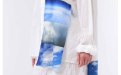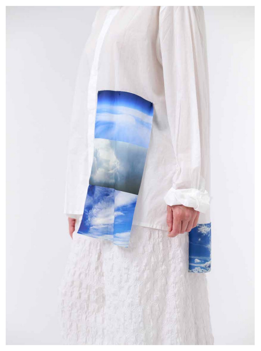 Ogni capo è parte di un racconto. Una camicia con maniche arricciate ricorda le nuvole o le ali di una farfalla. La modella che esce dal bozzolo e si muove con leggerezza come una farfalla. Le camicie con sfumature ascendenti che tingono il bianco come un cielo astratto. Un tessuto bianco lavorato in modo irregolare, con fili tirati in trama e in ordito, crea un cielo di nuvole morbide e imperfette. Bustine di tè cucite tra due strati di tessuto lasciano la loro impronta su top e camicie lunghissime: segni delicati del tempo. Un abito oversize bianco, essenziale nella forma, è arricchito da bolli ed elementi organici blu cuciti a mano. Velato da pannelli trasparenti di mussola bianca, come un ricordo che affiora e scompare, il visibile si intreccia con l’intuito. Gonne fluide e leggere, realizzate con cieli stampati tratti dallo Sky Project di Hirose. Un tessuto stampato con collage di piccole opere dell’artista dà forma a un look urbano e contemporaneo: l’arte si fa indossabile, da osservare da vicino. L'iconico “puppet dress”, ricamato con perle e sfere in una rilettura tessile della serie Tama. In giapponese Tama è, infatti, una sfera preziosa: perla, anima, spirito del linguaggio. Accessori-scultura come collane in filo metallico e perle diverse, piccoli cosmi da indossare. Anelli realizzati con collage di cieli di carta fatti a mano a Venezia, punto d’incontro tra Oriente e Occidente, sono affiancati ad anelli di pietra impreziositi da foglia d’oro che ne esalta l’unicità. I cieli della serie Sky Project - Il tuo cielo è il mio cielo vengono appuntati su camicie fluide, come fossero pensieri, mappe emotive, geografie intime da portare sul petto. Sul retro del lookbook, è presente un abito rotondo, simbolo di totalità e ciclicità, caro a entrambi gli autori. La sua superficie è punteggiata da piccoli fori e spruzzi di pittura bianca, come stelle lontane in un cielo silenzioso. Un gesto delicato che ci mette in contatto con la Via Lattea e con quel senso di mistero e connessione che attraversa l’intera collezione, sospesa tra il visibile e l’invisibile. Un omaggio alla bellezza che si scopre nei dettagli, nella leggerezza e nella poesia del quotidiano.