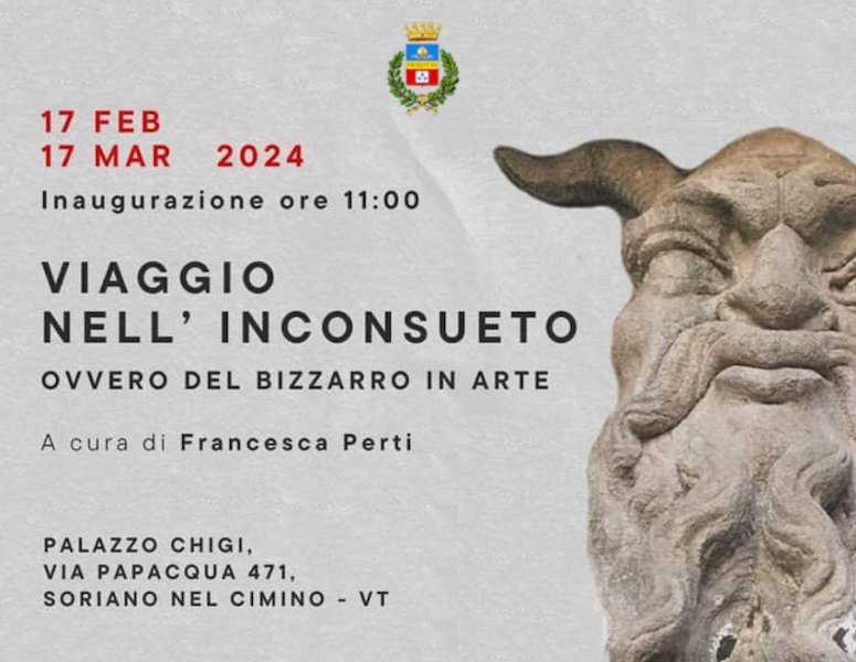 Sabato 17 febbraio 2024 alle ore 11.00, presso Palazzo Chigi - Albani a Soriano nel Cimino, inaugura la mostra Viaggio nell’inconsueto ovvero del bizzarro in arte, a cura di Francesca Perti, con il contributo e il patrocinio del comune di Soriano nel Cimino.
