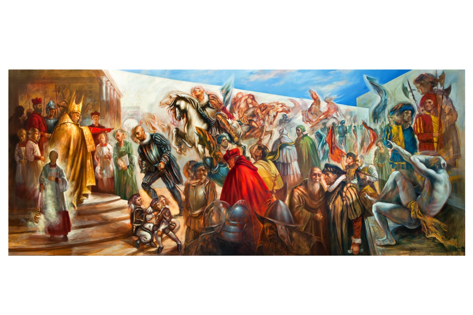 PRIMA OPERA - BENEDIZIONE E COMANDO PER UNA GRANDE FLOTTA- Con il primo e spettacolare quadro (400 x 200 cm)) Stefano Piani inizia il suo viaggio così come Marcantonio Colonna, in quel lontano 11.06.1570, spiegò le vele verso la città greca di Lepanto dopo aver ricevuto da Papa Pio V lo scettro del comando della flotta cristiana. L’opera raccoglie le emozioni di un momento solenne e fondamentale sia per la chiesa che per la storia della famiglia Colonna. La figura di Marcantonio e l’idea della futura battaglia diventano gli elementi cardine di tutto il progetto. Il tema qui è legato alla spiritualità, alla necessità dell’essere umano di guardare al divino come ispirazione e protezione.