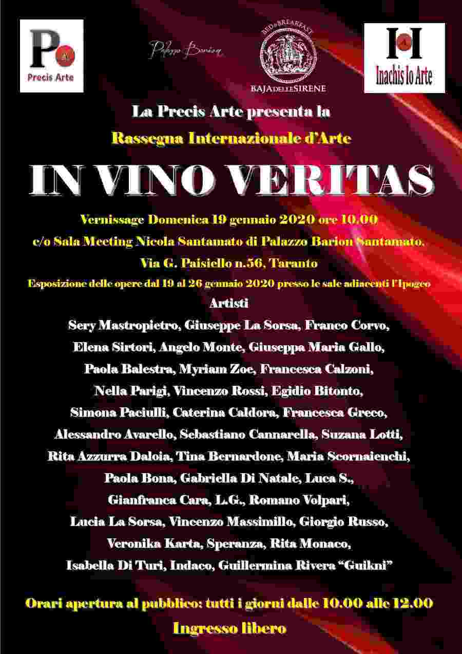 Domenica 19 gennaio 2020 alle ore 10.00 presso la sala meeting Nicola Santamato di Palazzo Barion Santamato, nel borgo antico di Taranto in via G. Paisiello n.56, ci sarà l’inaugurazione della rassegna Internazionale d’Arte “In Vino Veritas”, ideata ed organizzata dalla Precis Arte di La Sorsa Lucia. Presenti al Vernissage il dott. Arcangelo Santamato, il direttore artistico Vincenzo Massimillo, il curatore della Rassegna Lucia La Sorsa, responsabile della Precis Arte ed il poeta Antonello Vozza.