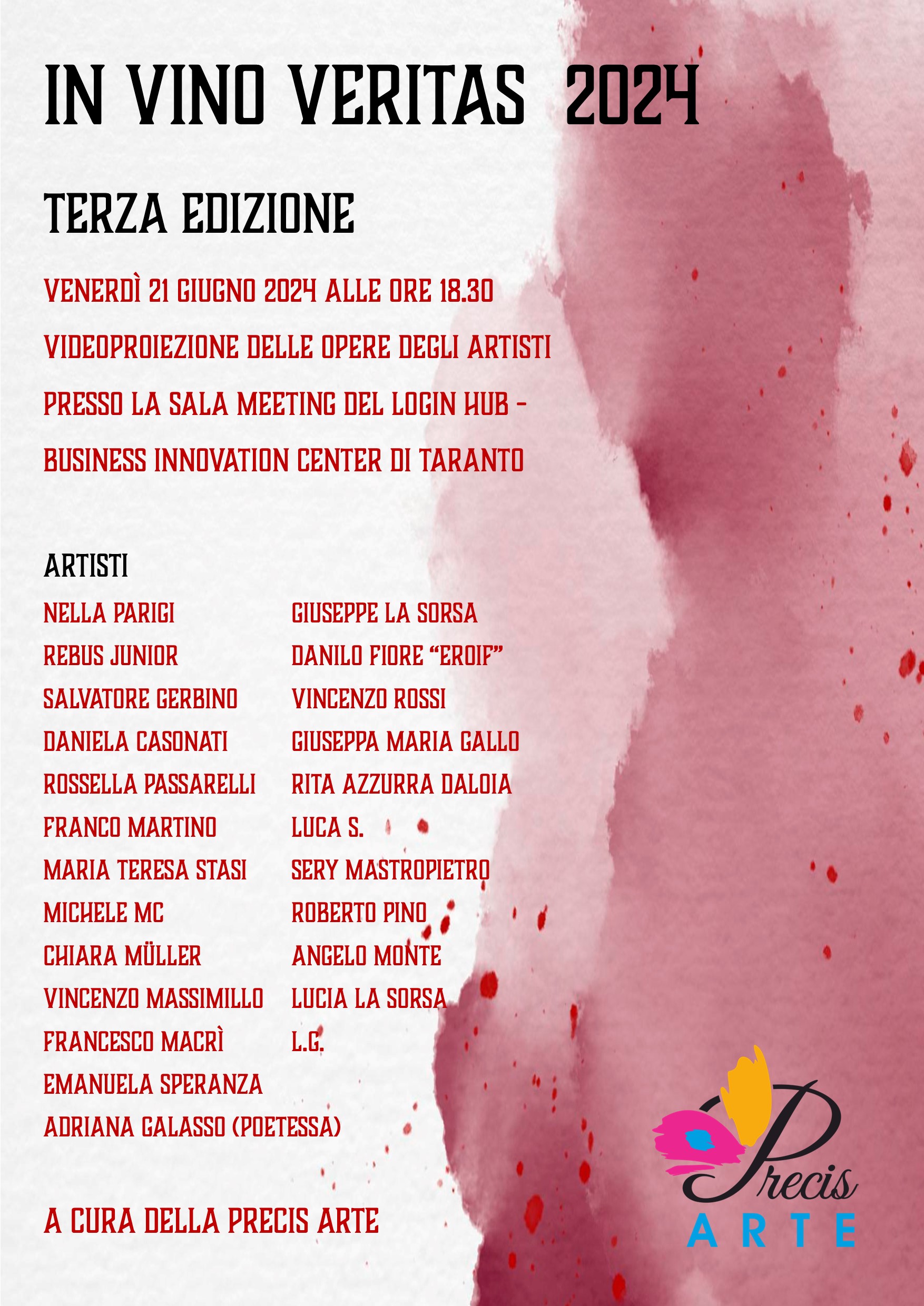 Venerdì 21 giugno 2024 alle ore 18.30 ci sarà l’inaugurazione di un progetto d’Arte a cura della Precis Arte di Lucia La Sorsa, la terza edizione di “In Vino Veritas” presso la sala meeting del Login Hub – Business Innovation Center a Taranto in Viale Virgilio n.20/D. Durante l’inaugurazione ci sarà la videoproiezione delle opere selezionate per questo evento e l’esposizione delle stampe su tela delle opere con gli interventi del curatore della mostra Lucia La Sorsa e del direttore artistico Vincenzo Massimillo. Nasce nel 2020 questo progetto in cui viene chiesto a ciascun artista di realizzare un’opera che verrà utilizzata per rendere unica l’etichetta di una bottiglia di vino. La prima edizione si inaugurò nel mese di gennaio 2020 presso Palazzo Barion Santamato a Taranto mentre è stato l’Eden Park Hotel di Pulsano la sede della seconda edizione nel 2022. Un progetto che si conferma itinerante.