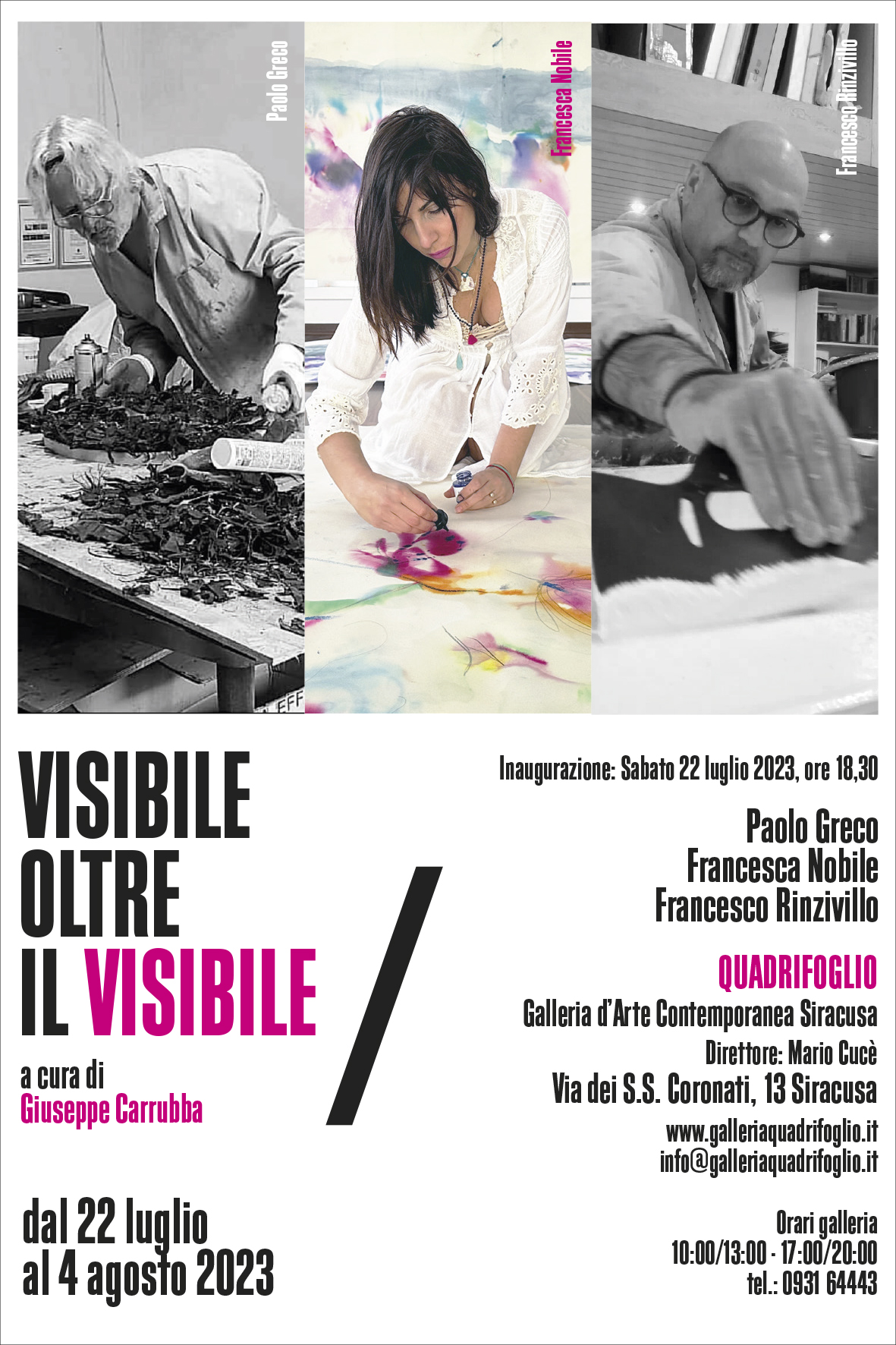 Lo spunto dalle naturali diversità delle tre esperienze artistiche ha dato modo a Giuseppe Carrubba, critico d’arte e curatore indipendente, di seguire la traccia del segno che attraversa le varie forme oltre la superficie. In questa indagine nasce quel visibile che si apre a nuovi livelli percettivi, secondo dinamiche contemporanee dettate dai binomi assenza-presenza, occultamento-rivelazione. Carrubba di fatto specifica: «Paolo Greco, Francesca Nobile e Francesco Rinzivillo, in Visibile oltre il visibile, mettono in campo aspetti relazionali e simbolici differenti, generano livelli di percezione in continua evoluzione, per indagare quell’aspetto liminare, qualcosa che emerge dalla condizione intermedia tra la luce ed il buio, l’immagine e l’astrazione, l’impronta o la sua ombra, l’indizio e la sparizione, il vuoto e l’infinito».