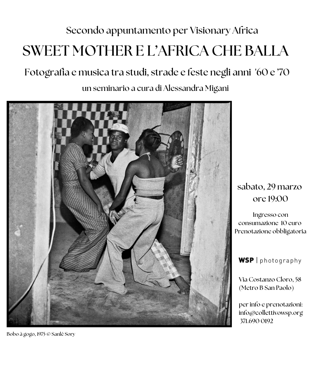 WSP presenta “Sweet Mother e L’Africa che Balla, Fotografia e Musica tra studi, strade e feste tra gli Anni ’60 e ’70“, secondo appuntamento del ciclo di seminari “Visionary Africa” a cura di Alessandra Migani, che si svolgerà sabato 29 marzo dalle ore 19 presso la nostra sede in Via Costanzo Cloro 58, Roma.