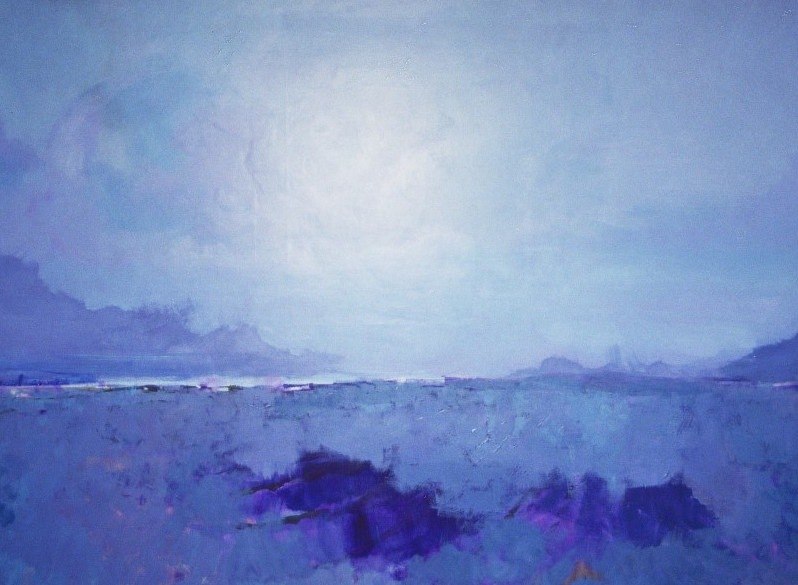 Acquerelli azzurri ci conducono nella sala più ampia, il secondo spazio dedicato all'itinerario della mostra, dove incontriamo i “Campi di lavanda a sera”, il tema della notte, del mistero dove la presenza umana risulta solo vagamente ammiccata.