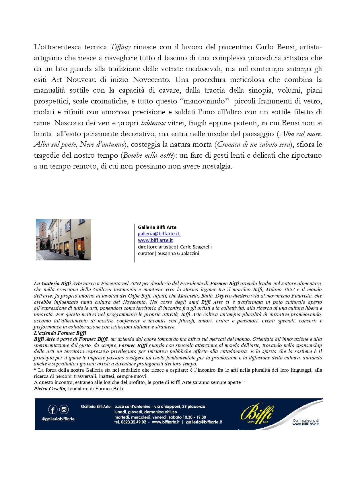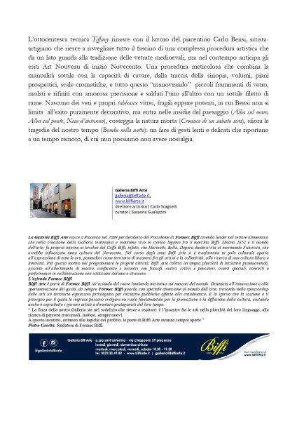 L’ottocentesca tecnica Tiffany rinasce con il lavoro del piacentino Carlo Bensi, artistaartigiano che riesce a risvegliare tutto il fascino di una complessa procedura artistica che da un lato guarda alla tradizione delle vetrate medioevali, ma nel contempo anticipa gli esiti Art Nouveau di inizio Novecento. Una procedura meticolosa che combina la manualità sottile con la capacità di cavare, dalla traccia della sinopia, volumi, piani prospettici, scale cromatiche, e tutto questo “manovrando” piccoli frammenti di vetro, molati e rifiniti con amorosa precisione e saldati l’uno all’altro con un sottile filetto di rame. Nascono dei veri e propri tableaux vitrei, fragili eppure potenti, in cui Bensi non si limita all’esito puramente decorativo, ma entra nelle insidie del paesaggio (Alba sul mare, Alba sul ponte, Neve d’autunno), costeggia la natura morta (Cronaca di un sabato sera), sfiora le tragedie del nostro tempo (Bombe nella notte): un fare di gesti lenti e delicati che riportano a un tempo remoto, di cui non possiamo non avere nostalgia.
