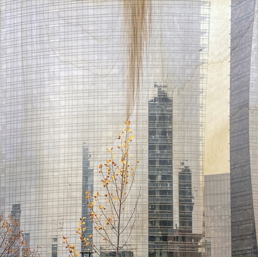 Fusioni digitali tra immagini, sovrapposizioni di piani differenti, inclusioni di elementi tridimensionali vanno così a definire paesaggi di campagna, scorci di città, ingrandimenti di foglie, ma anche eleganti composizioni con una decisa componente concettuale. Questi “dispositivi visivi” si propongono di creare nell’osservatore momenti in cui sperimentare istanti pacificanti e di contemplazione, tramite l’unione della fotografia – arte che cattura l’impermanente – con la matericità del supporto, che diventa parte fondamentale del pensiero. I legni utilizzati da Walter Turcato hanno caratteristiche tra loro uniche, sia a livello estetico sia strutturale: il legno, un materiale “vivo” che stimola una fruizione visiva, tattile e olfattiva, favorisce un approccio accogliente e un’empatica condivisione di sentimento, in un dialogo ricco di significati che meglio possono giustificare il nostro essere parte attiva della creazione. Essenze, appunto.