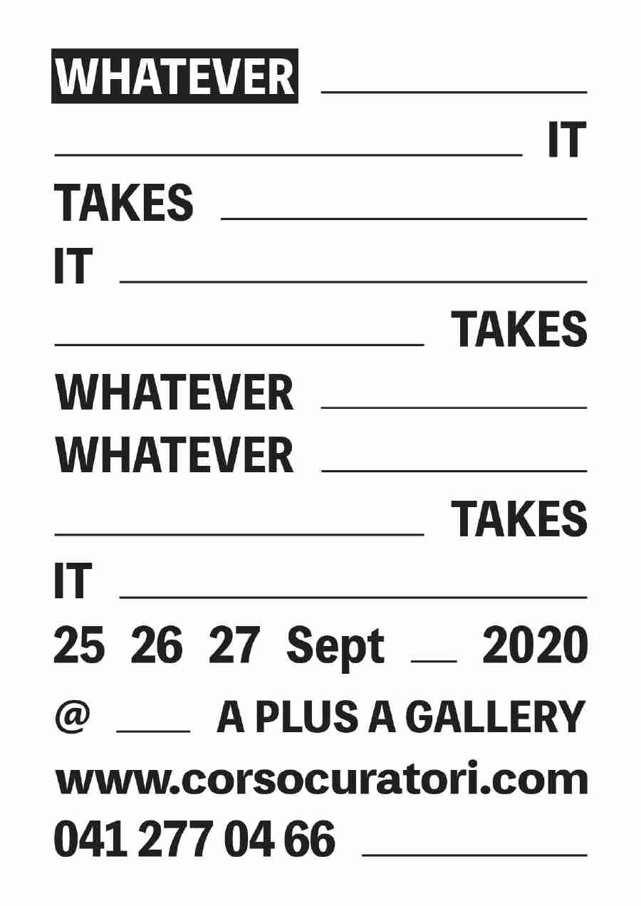 Partendo da questi presupposti e conscio delle difficoltà storiche, il progetto Whatever it takes, pone nuovamente in dialettica il principio dell’individualismo con un principio altrettanto fondamentale — il discorso sulla “comunità”, sullo “stato” e sul “linguaggio della collettività” anche nell’arte.