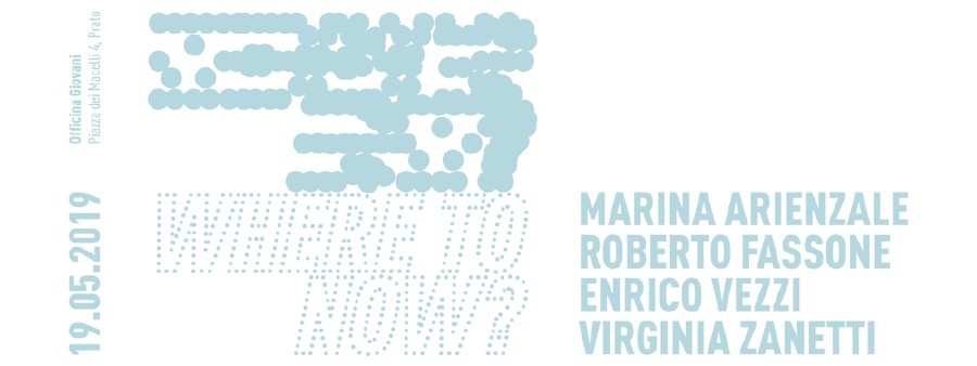 ESTUARIO project space, in collaborazione con il Comune di Prato e Officina Giovani, si “presenta” il 19 maggio 2019 dalle 18,30 aprendo i propri spazi e inaugurando WHERE TO NOW?, progetto collettivo derivato dal laboratorio Fare arte contemporanea, con interventi degli artisti Marina Arienzale, Roberto Fassone, Enrico Vezzi, Virginia Zanetti.