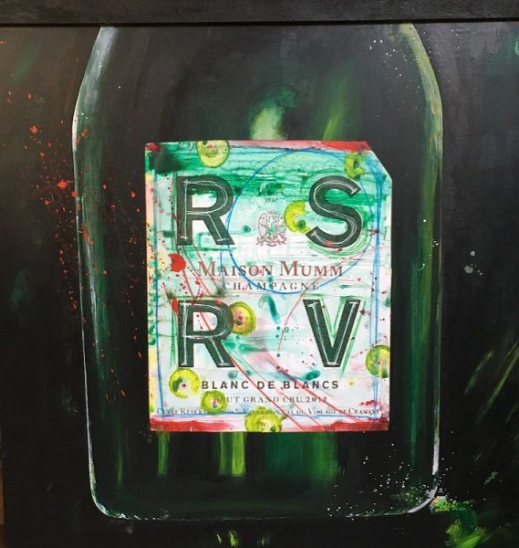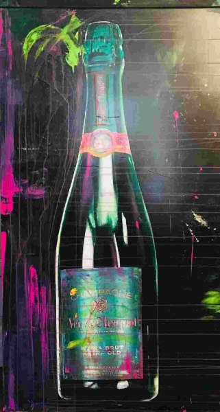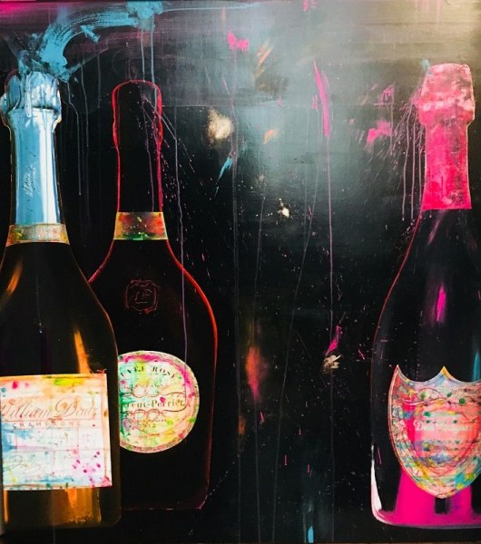 Non più le figure umane con i loro sentimenti che da sempre caratterizzano le opere di Nini, bensì bottiglie di Champagne. Perché lo Champagne?