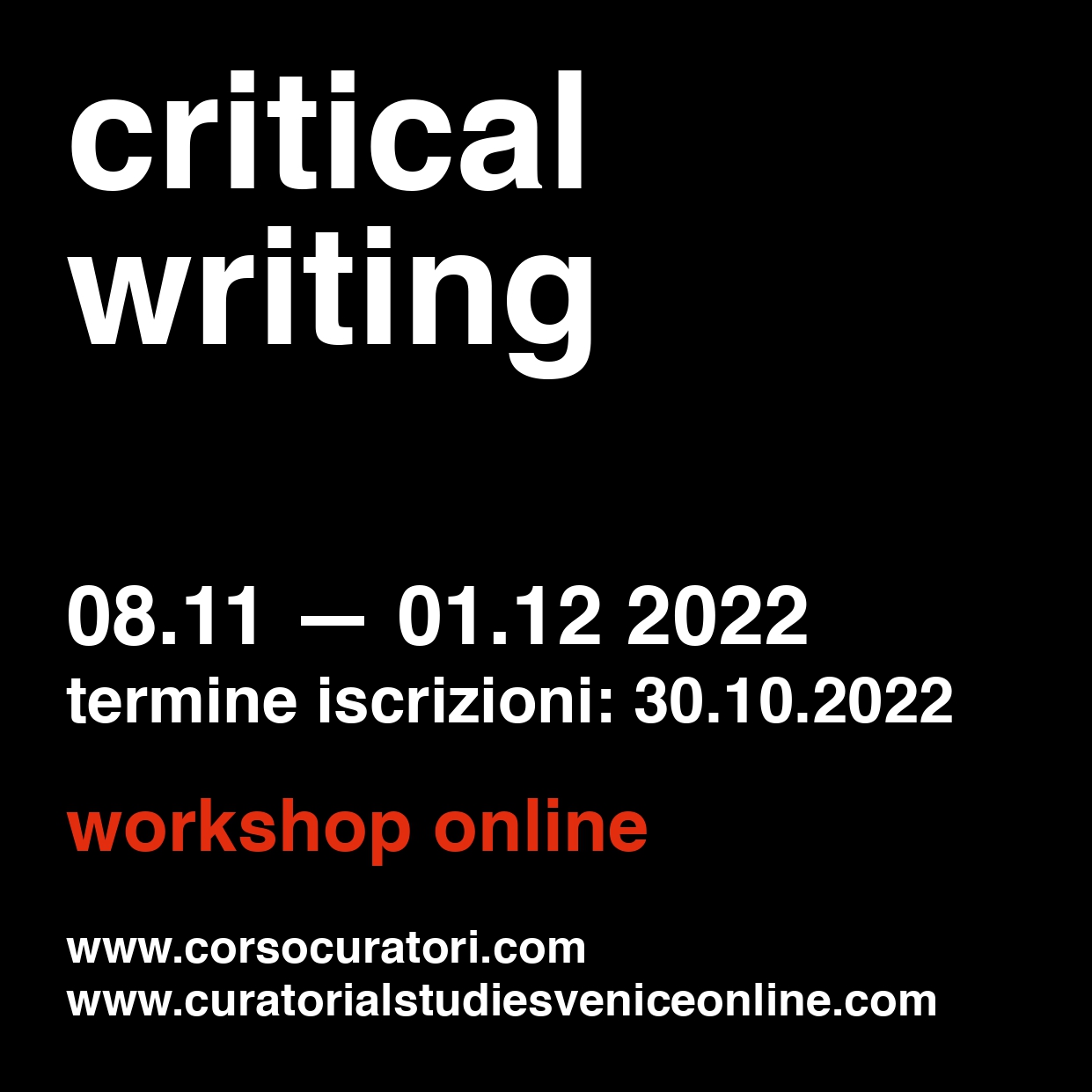 La critica d'arte è essenziale per lo sviluppo di un pensiero dinamico e stimolante. Nel campo della pratica curatoriale e artistica, delle buone capacità di scrittura combinate a una mentalità critica sono un vantaggio che agevola su svariati livelli. Riuscire a strutturare con successo un testo per un progetto espositivo, scrivere un saggio per un catalogo, elaborare un comunicato stampa sono tra gli obiettivi da raggiungere con questo corso. Durante questo percorso insieme ci dedicheremo alla stesura di recensioni critiche di mostre d’arte e impareremo come formulare un'idea con chiarezza. Analizzeremo e valuteremo l'arte e la sua esposizione in modo ponderato e significativo. I metodi critici da applicare a seconda della finalità (rivista d'arte, giornale, blog, ecc.) verranno discussi con una serie di esempi ed esercizi pratici.