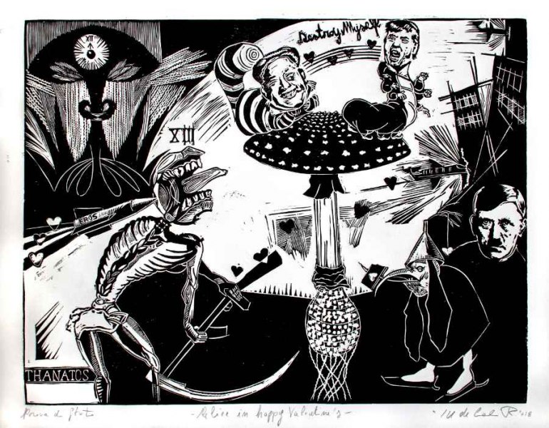 […] Questi elementi si ritrovano, in opere frutto di sperimentazioni recenti, nella serie Yo lo vì, composta da 8 incisioni, o meglio linoleumgrafie […]. Il titolo della serie già rimanda a uno dei più grandi artisti spagnoli di sempre, Francisco Goya y Lucientes (1746-1828): la scritta Yo lo vì, tradotta dallo spagnolo all’italiano con “Io lo vidi”, compare in due delle numerose incisioni parte della serie chiamata Disastri della guerra, iniziata nel 1810, con cui Goya intende testimoniare eventi a lui contemporanei. […] Allo stesso modo Mauro de Carli, artista engagé, si fa testimone attivo del presente e degli avvenimenti storici, politici, sociali del nostro tempo, e li evoca stilizzando volti di politici, usando immagini e simboli noti, loghi imperanti, riferimenti legati alla storia dell’arte. L’immagine diventa protagonista indiscussa del supporto ed è viva, crea movimento, flussi e girandole di significati che in modo diretto e incisivo arrivano allo spettatore, comunicando in maniera efficace la visione di de Carli su temi attuali. Anche alcune scritte contribuiscono ad arricchire la narrazione, in una rete di collegamenti tra passato e presente, immaginato e reale, che aumenta l’effetto di surrealtà pur parlando in modo chiaro di fatti concreti.