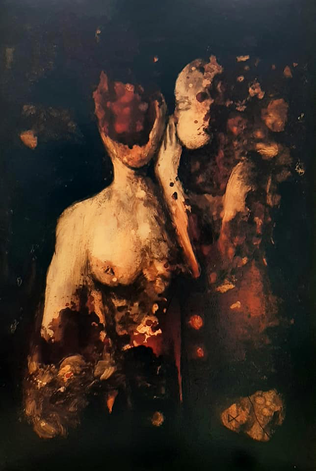 La visione di un unico corpo vivente, da sempre oggetto di ricerca per l'artista, ritorna in queste opere ancora più vivida e si trasforma grazie agli smalti sintetici adoperati, in immensi spazi onirici vissuti da figure in relazione tra di loro.