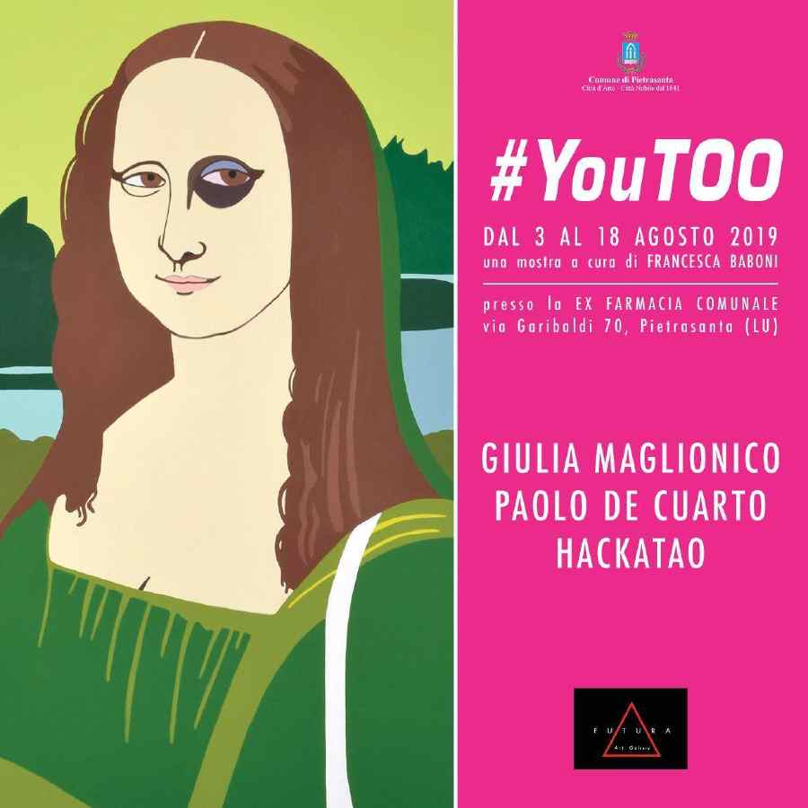 Sabato 3 agosto alle ore 19:30 inaugura la mostra collettiva #YouToo presso il nuovo spazio espositivo Ex-Farmacia comunale di Pietrasanta. L'esposizione è realizzata dalla Futura art Gallery con il patrocinio del comune di Pietrasanta. Tre gli artisti in mostra – Paolo de Cuarto, Hackatao e Giulia Maglionico – che si muovono tra il linguaggio pop e street con un piglio ironico e spesso dissacrante e che propongono una nuova rilettura del fenomeno di grande attualità della violenza sulle donne. Ognuno dei tre artisti mostra una visione differente della tematica che si allarga alla condizione della donna contemporanea, tra machismo e un redivivo femminismo. Lo stesso titolo difatti, che fa riferimento all’omonima serie di opere inedite di Giulia Maglionico, intende parafrasare il movimento #MeToo con un deciso richiamo mediatico all'hashtag diventato ormai virale.