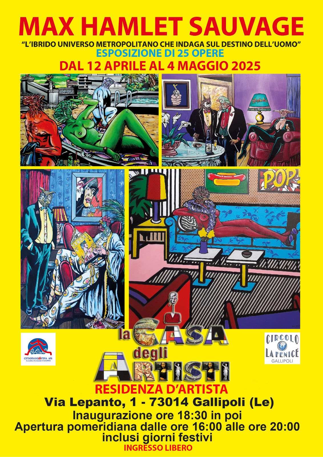 La mostra, presentata dal noto scrittore Maurizio Nocera e costituita da 25 opere, è intitolata “L’Ibrido Universo Metropolitano che indaga sul destino dell’Uomo”: un titolo lungo ma che riassume in poche parole significative il messaggio personale dell’artista. Le opere in esposizione sono una sequenza narrativa nella quale si possono riconoscere i temi cari a Max Hamlet Sauvage: scollacciate figure femminili che si offrono ad ibridi maschili in cui le teste di uccello o animale fanno supporre l’“animalità” appunto che si nasconde dietro l’armoniosa eleganza.