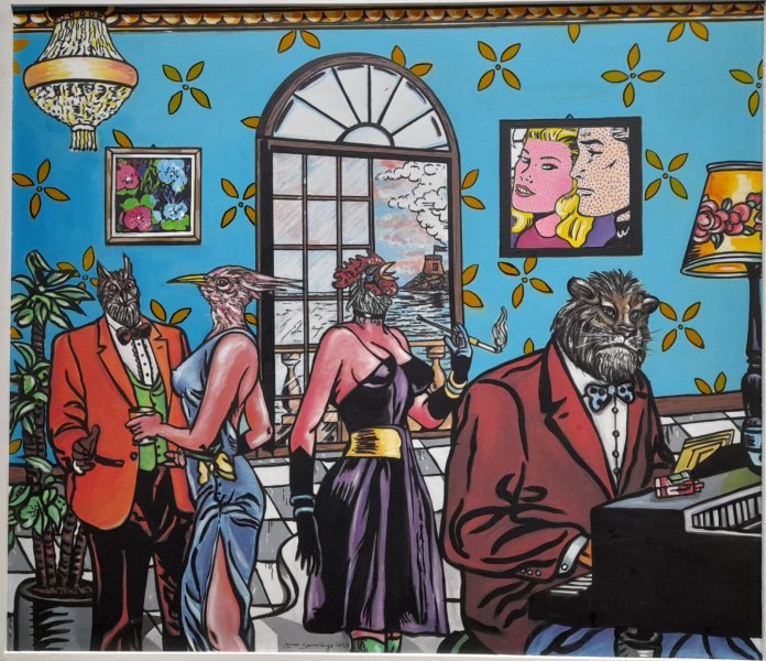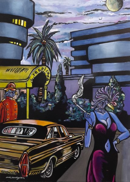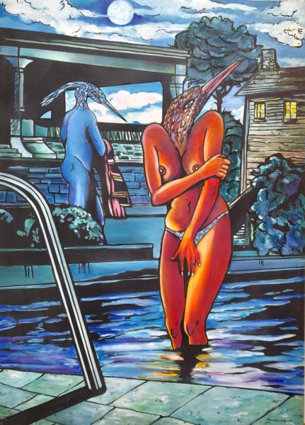 Sempre dalle sue opere si evince la critica all’opulenta società occidentale che si congiunge ad una favolistica moderna rappresentata, alla maniera di Max Ernst, “da uccelli che vivono borghesemente e che con l’alta borghesia condividono bisogni e desideri erotici (Giorgio Di Genova, critico e storico dell’arte).