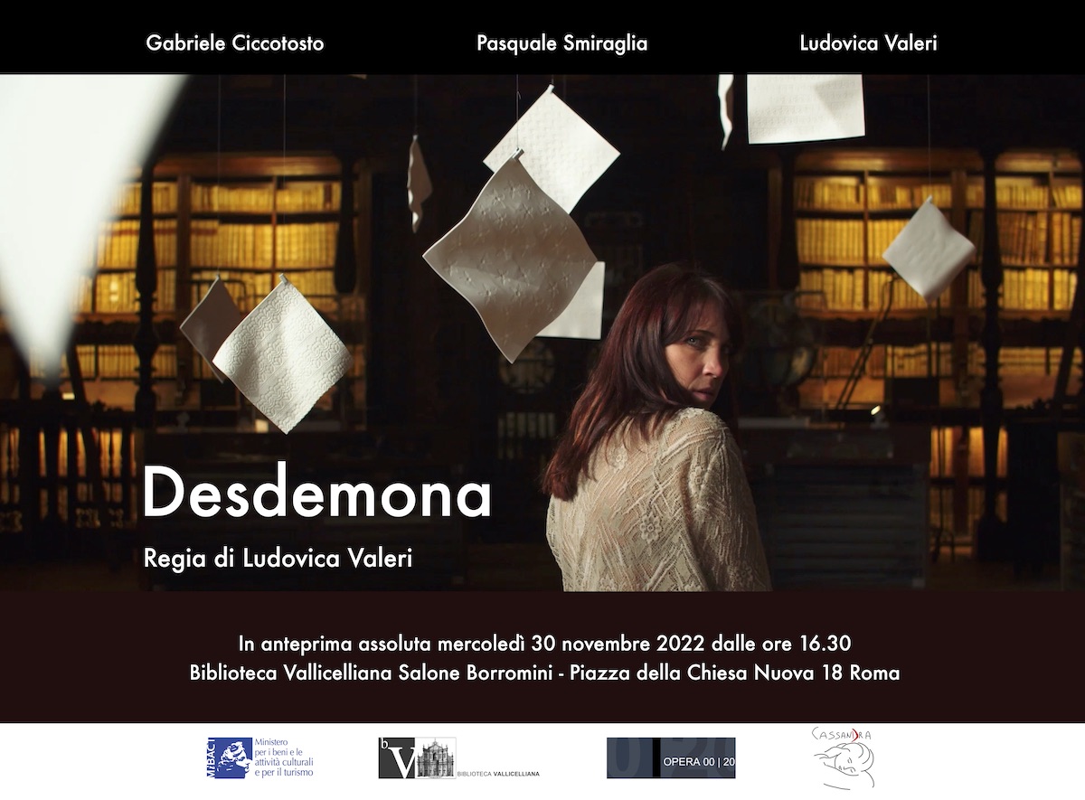 Il 30 novembre 2022, in prossimità della Giornata internazionale per l’eliminazione della violenza contro le donne, nel prestigioso Salone Borromini della Biblioteca Vallicelliana sarà proiettato in anteprima assoluta il cortometraggio “Desdemona” per la regia di Ludovica Valeri.