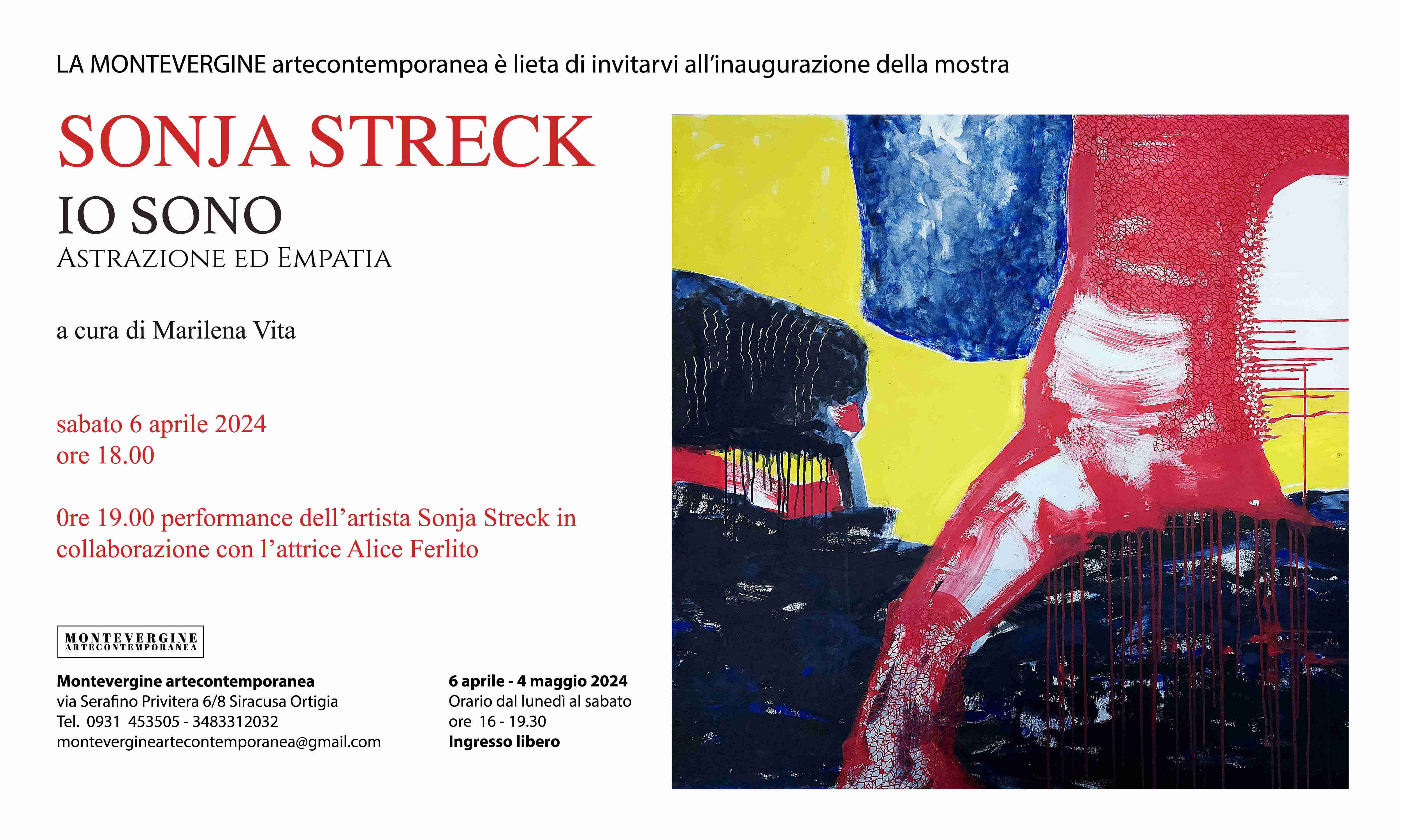 Dal 6 aprile al 4 maggio 2024 la galleria Montevergine artecontemporanea (Via Serafino Privitera, 6/8, Ortigia, Siracusa) ospiterà la personale "IO SONO astrazione ed empatia" di Sonja Streck, a cura di Marilena Vita (inaugurazione sabato 6 aprile ore 18.30, ingresso libero).