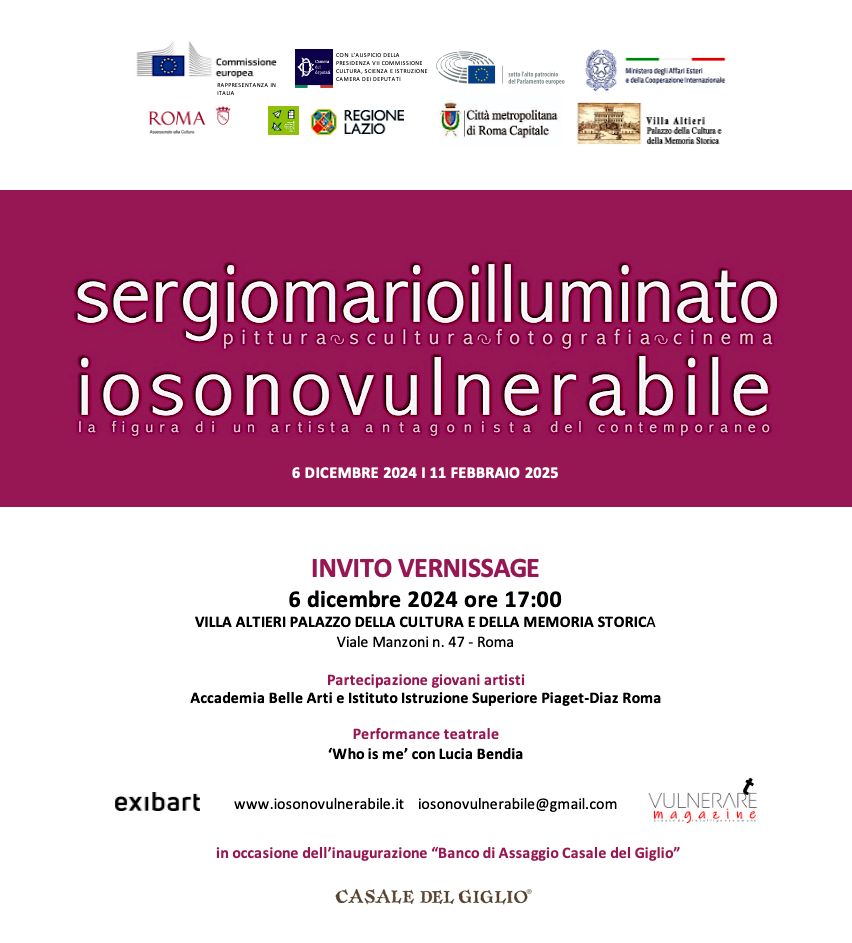 Dal 7 dicembre 2024 all’11 febbraio 2025 Villa Altieri, Palazzo della Cultura e della Memoria Storica a Roma ospita IOSONOVUNERABILE, la mostra che racconta il progetto transdisciplinare di Sergio Mario Illuminato nato dalla residenza artistica nell’ex Carcere Pontificio di Velletri.