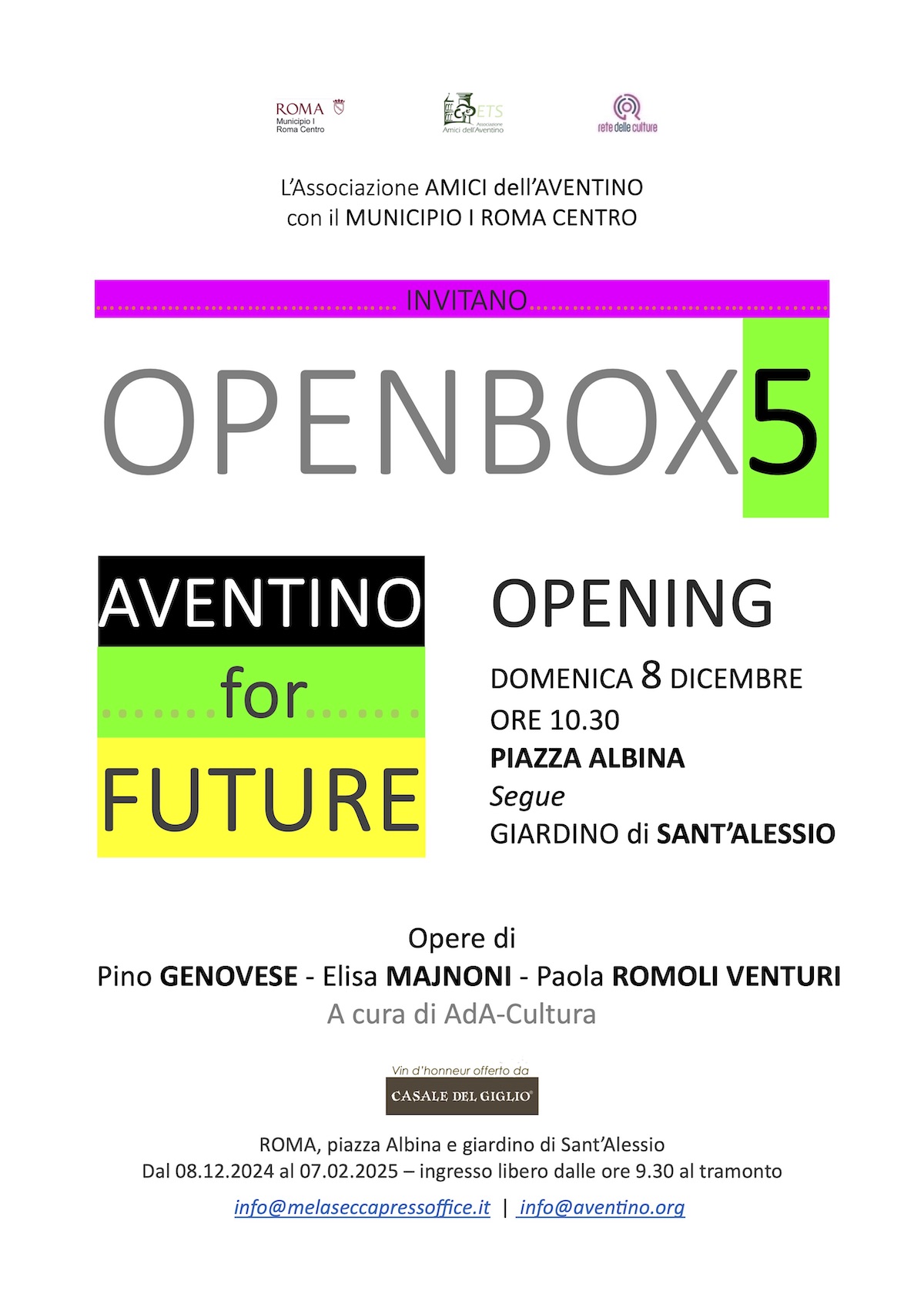 Dal testo critico di Daniela Gallavotti Cavallero: «Contigua all’Aventino, nella piana fra il Tevere e le Mura Aureliane era sorta, tra l’età augustea e la metà del terzo secolo d.C., la prima discarica differenziata di Roma, nella quale sono state accumulate cinquantatrè milioni di anfore olearie con criteri precursori dei moderni regolamenti in materia di raccolta selettiva. Non potendo essere riutilizzati, i recipienti di terracotta impregnati di residui rancidi venivano ridotti in pezzi per diminuire l’ingombro e accumulati in strati ordinati, regolarmente irrorati di calce e ricoperti di terra per ragioni igieniche, fino a raggiungere un’altezza di trentasei metri e il perimetro di oltre un chilometro. Pur essendo una vera e propria discarica a cielo aperto, il “monte de vasa in tucto rocte” come veniva definito nel rinascimento rispondeva a criteri di rispetto ecologico forse anche per la nostra sensibilità contemporanea, al buon uso di un’ansa di terreno al servizio dei commerci in arrivo al vicino porto fluviale. Tanto che, negli anni Trenta del Novecento, l’architetto Raffaele de Vico – artefice negli stessi tempi anche del giardino degli Aranci e di molti altri giardini di Roma - potè trasformare il Monte dei Cocci in parco quasi senza interventi strutturali. Anche l’Aventino nel suo percorso da zona agricola a insediamento urbano a bassa densità costituito nei primi decenni del Novecento rappresenta un aspetto della stessa modalità esemplare di uso coscienzioso del territorio. Con queste premesse l’edizione di OpenBox5 di quest’anno 2024 intende contribuire, attraverso le opere collocate in piazza Albina e nel giardino di Sant’Alessio, alla consapevolezza della responsabilità individuale guardando agli esempi virtuosi del passato.