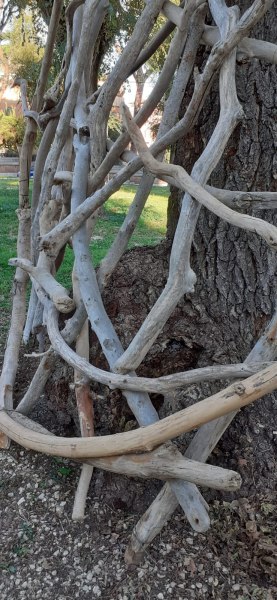Il pannello con l’Anfora di terracotta di Elisa Majnoni nel Giardino di Sant’Alessio può essere assunto come modello positivo ispirato al Monte dei Cocci, mentre il Cane che si morde la coda girando su se stesso senza fine sopra un mandala mentre uno stormo di uccelli vola in cerchio sopra di lui traduce lo straniamento e l’ineluttabilità del modello contemporaneo. Fra i due momenti si colloca la figura antropomorfa del Pensatore, sospesa a mezz’aria come una divinità mitologica e protettrice. Ancora più esplicito è l’avvertimento di Paola Romoli Venturi con le installazioni Molti Molta Molte - Il luogo del delitto che si articola nella piazza, dove un nastro segnaletico delimita l’impronta di una grande balena, che si intuisce morta e rimossa, e L’Isola dell’Aventino - L’arma del delitto, nel giardino, dove giace lo stomaco del cetaceo, pieno di bottiglie di plastica la cui consistenza lattiginosa inganna e condanna gli animali del mare che la confondono con quella delle meduse. La scultura è realizzata con plastica endogena raccolta sul territorio dell’Aventino in collaborazione con gli allievi della scuola Giacomo Badini attraverso il laboratorio Salva la tua balena!. L’arma di difesa contro il pervasivo dominio dell’innaturale è il ritorno alla natura, alle forme e ai materiali primigeni suggerito da Pino Genovese con la sua Costellazione di pietre levigate scure e chiare racchiuse a una a una entro nodi di corda e appese contro il muro della chiesa di Sant’Alessio. E con lo scudo, L’Armatura di legni intrecciati appoggiata, per proteggere, sulla anomala escrescenza di un albero in piazza Albina.»