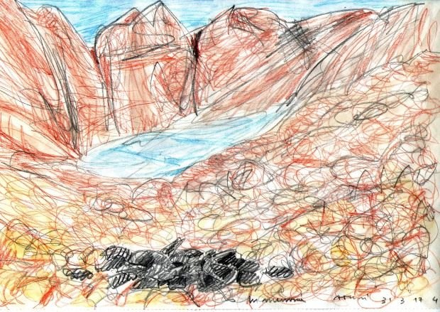 In questo tavolo di gioco, 36 piccole pietre nere faranno la loro breve comparsa il 22 luglio sulla morena del piccolo Calderone, nella conca del lago effimero. Pietre levigate dal ghiaccio, ammorbidite dall’acqua, diventate fossili neri. Sono piccole macchie nella grande conca, a 2670 metri, all’ombra del Corno Grande, che per poche ore invitano al raccoglimento e alla riflessione. La loro vista improvvisa, in memoria del Lago Sofia, manifesta lo stupore e la meraviglia verso l’ambiente che cambia.