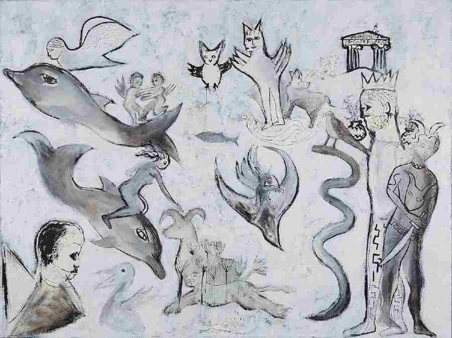 Il verso dell'Iliade che dà il titolo alla mostra - Scendeva simile alla notte - e che nel poema omerico è riferito al dio Apollo, è qui rivolto anche alla figura di Dioniso, dio greco del vino e dell'ebbrezza, archetipo della vita indistruttibile secondo la celebre definizione di Károly Kérenyi.